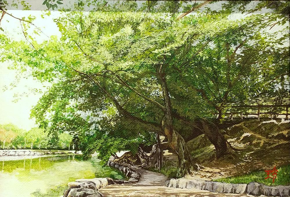 岡本玲『鷺池 夏』サムホール 肉筆画 キャンバス 額縁付き